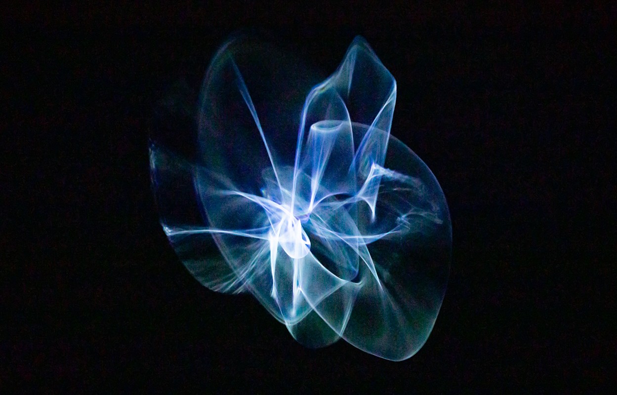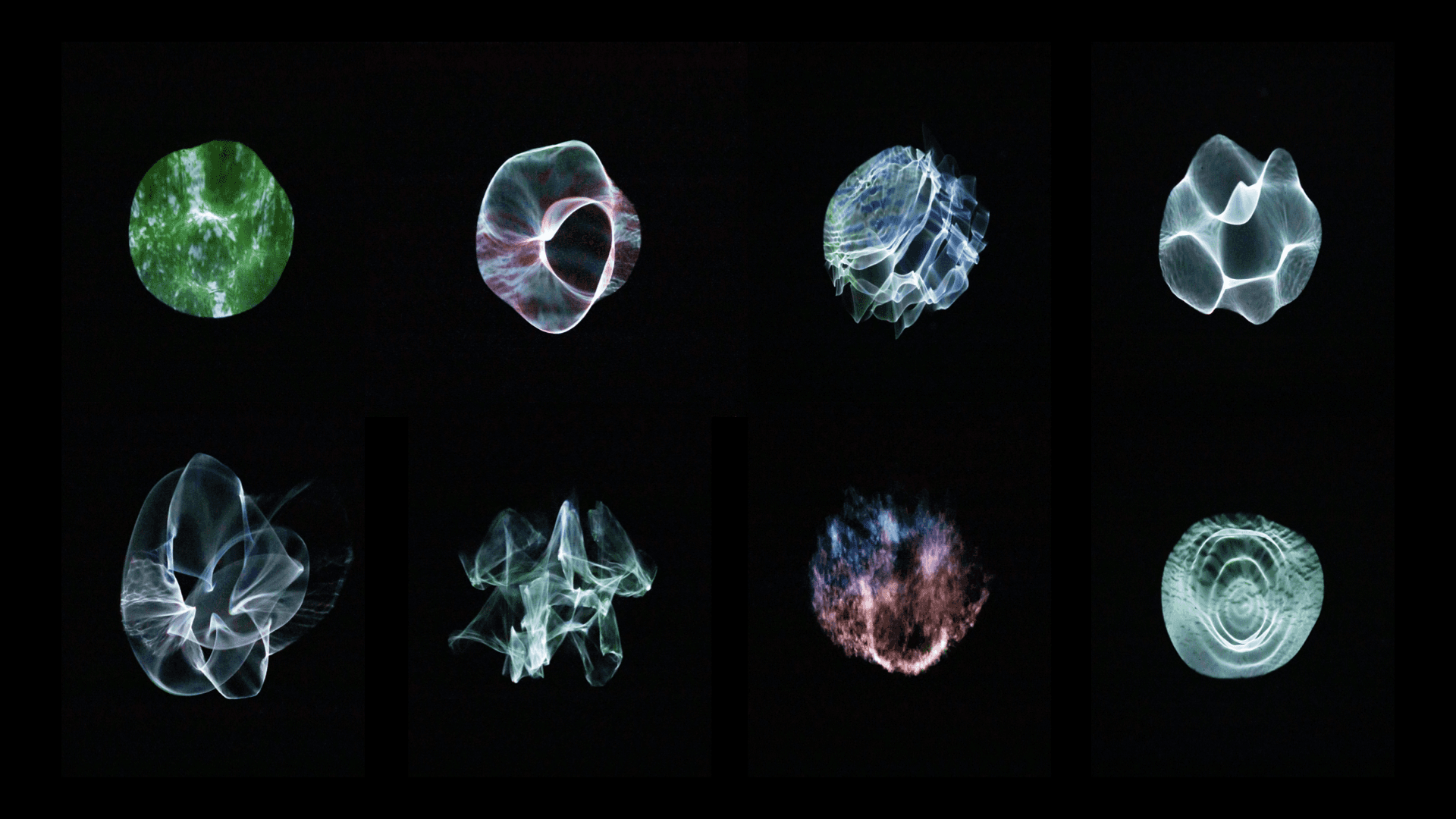 Visuals are the result of reflected ripple patterns. Projected image bounces off the pond and casts isolated reflections onto the back wall.